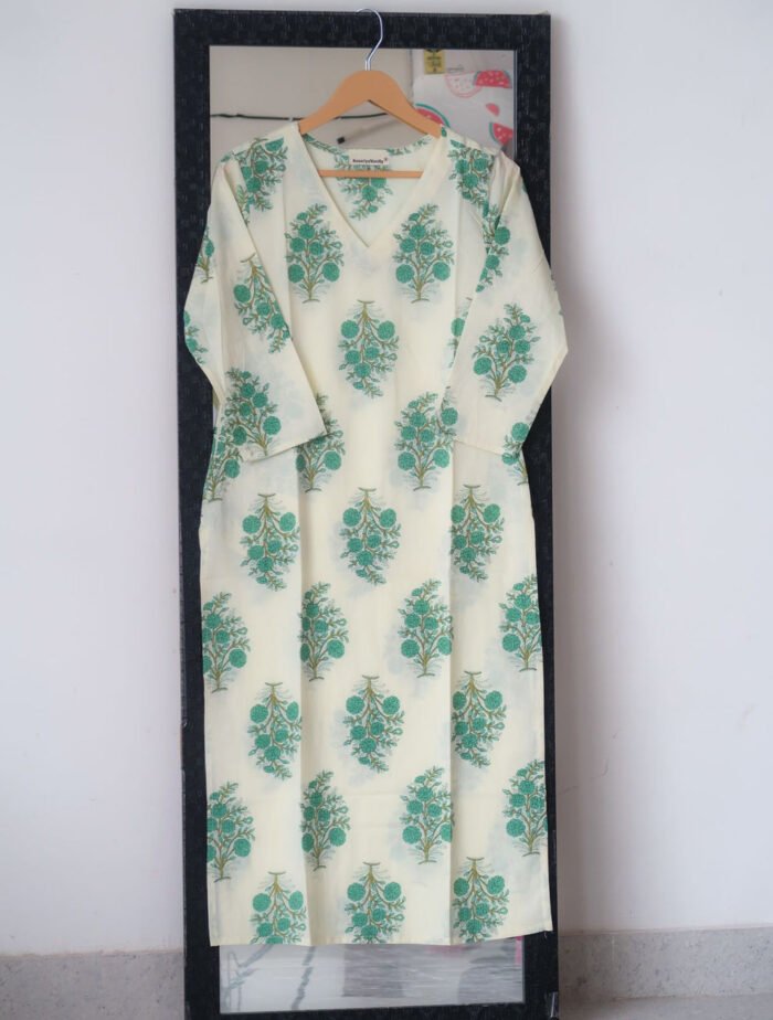 The V-neck style adds a touch of elegance, while the half sleeves ensure comfort during warm summer days. Versatile and effortlessly chic, this kurta pairs seamlessly with palazzos or jeans, offering a flawless look for any occasion. Embrace the essence of summer in style with this stunning piece that promises comfort, grace, and endless compliments.