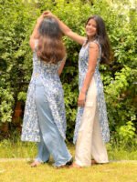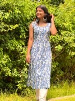 This pure cotton long sleeveless kurta features a subtle grey base, enhanced by delicate off-white floral prints that offer a touch of understated elegance. The soft grey color provides a versatile backdrop, while the intricate floral design adds a refined charm.