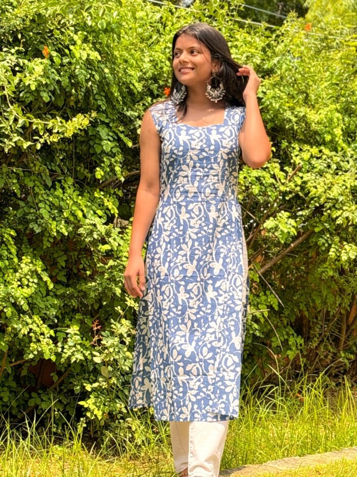 Made from breathable cotton, the kurta ensures all-day comfort, and its sleeveless cut lends a contemporary flair. Ideal for pairing with jeans for a casual look or with a palazzo for a more polished ensemble, this kurta combines modern style with classic sophistication.